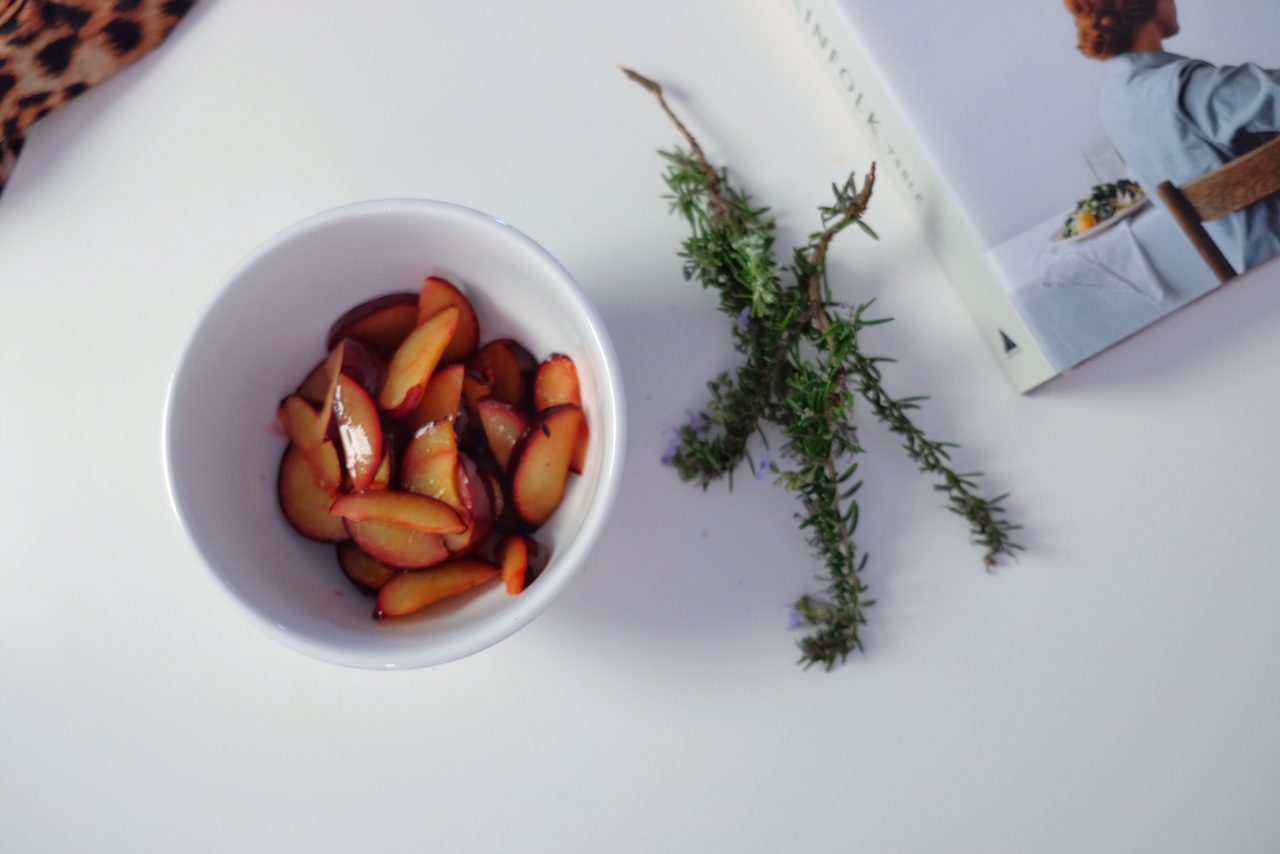 Quarter your plums, and then quarter again so you have perfect slices of plum, and place in a bowl. Add water, vanilla and coconut sugar and mix well. Picking the leaves of your rosemary, add to the bowl and mix gently through. Pop the bowl in the fridge to marinate.